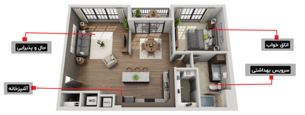 • کف‌سازی، گچ‌کاری، رنگ و نورپردازی حرفه‌ای